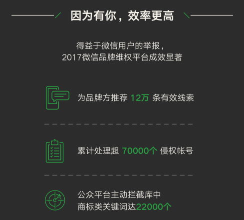 据了解,2018年3月,微信团队还将举办微信品牌权利人保护大会,并发布完整的《2018微信品牌权利人保护报告》。