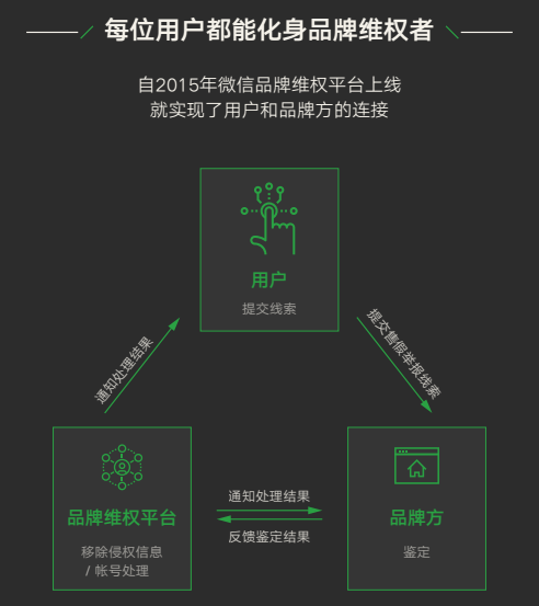 随着微信功能的不断丰富以及用户的日益增多,部分不法用户利用微信发送假冒商品信息,为解决此问题,2016年微信正式推出了品牌维权平台,实现用户和品牌方的连接,接入平台的品牌方,可对用户举报的线索进行鉴定,并将鉴定结果反馈给平台处理。