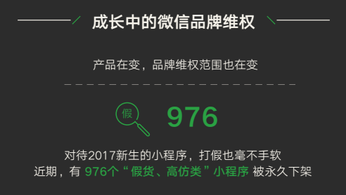 此外,针对近期出现的“假货、高仿”类小程序,微信团队也提出了对应的打击策略,永久封禁了 976 个 “假货、高仿 ”类小程序,并将通过注册、认证和审核环节的拦截限制以及电子化的侵权投诉渠道,保护各大品牌商户的合法权益。