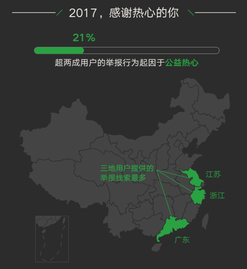 根据微信品牌维权平台数据,2017年有超两成用户的举报行为起因于公益热心,广东、江苏、浙江三地的用户提供的侵权线索数量最多。