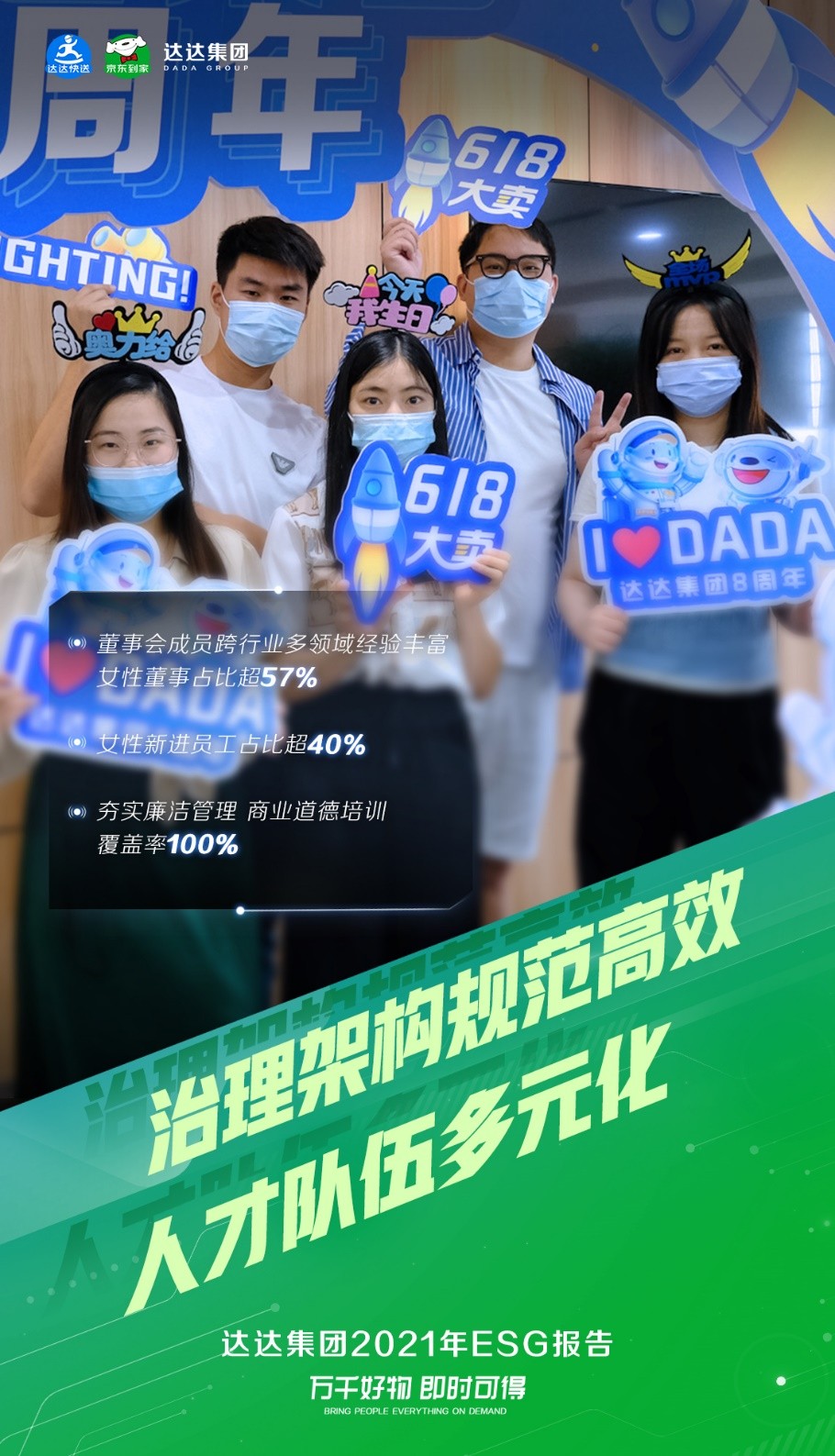 作为在新领域快速发展的成长型企业,达达一直以来秉承着务实、主动的价值观念,致力于打造与时俱进、开放、具有冒险精神的企业文化。并将环境、社会及治理(ESG)也逐渐融入达达经营管理与决策的理念当中。