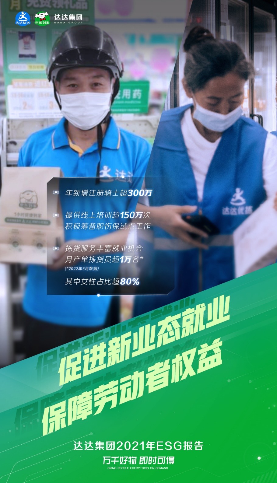 此外,基于众包组织模式,集团推出的拣货服务达达优拣,进一步丰富了灵活就业人员的工作机会。自达达优拣服务推出以来,越来越多的零售商门店使用该服务,拣货员持续增长。2022年3月,月产单众包拣货员超过1万名,其中女性占比超过80%。