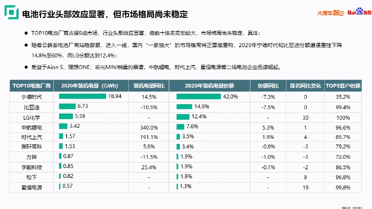 电池行业头部效应显著,但随着日韩系电池厂商站稳脚跟,国内“一家独大”的市场格局将正面临重构,2020年宁德时代和比亚迪份额遭遇重挫下降,LG化学份额提升,并且二线电池企业迅速崛起。主机厂为了降低企业经营成本和风险,一方面新增外部电池配套厂商,另一方面自建或合资电池厂,布局电池业务,保障核心技术自主可控。